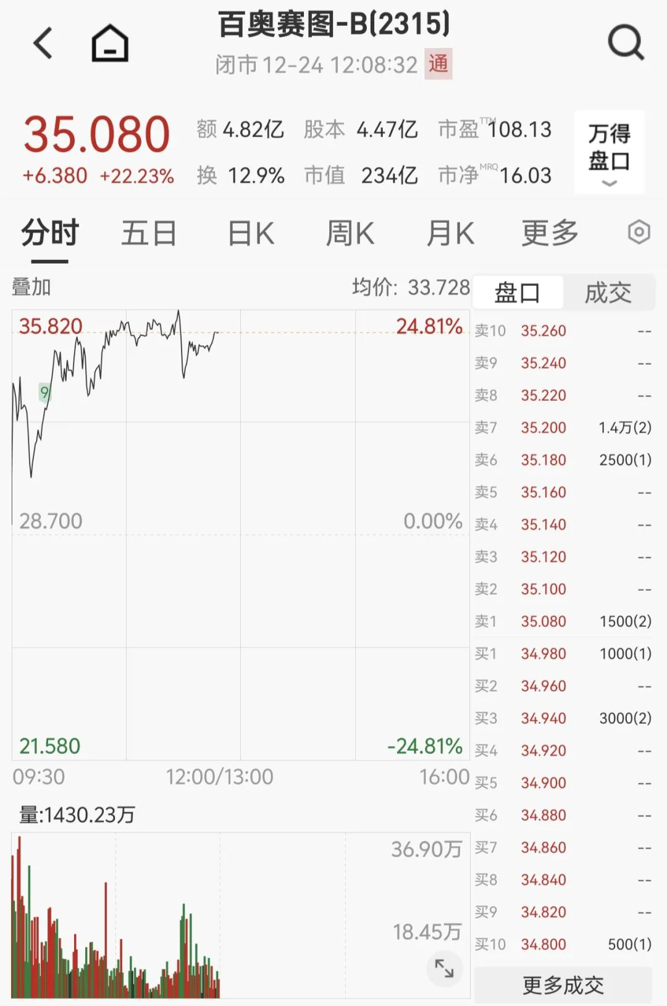 12月24日,百奥赛图获纳入港股通标的,公司股价高开高走,一度大涨24.81%,截至收盘报35.08港元,涨22.23%,为股民送上圣诞大礼包。