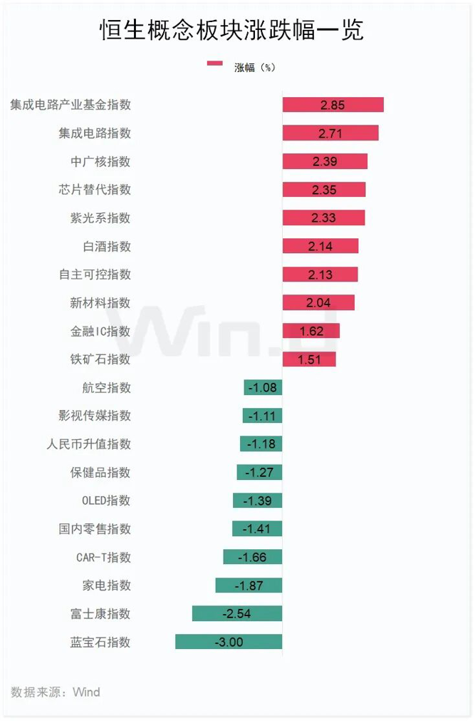 从盘面来看,Wind概念板块涨跌不一,集成电路产业基金指数涨2.85%,集成电路指数涨2.71%,中广核指数涨2.39%;蓝宝石指数跌3%,富士康指数跌2.54%,家电指数跌1.87%。