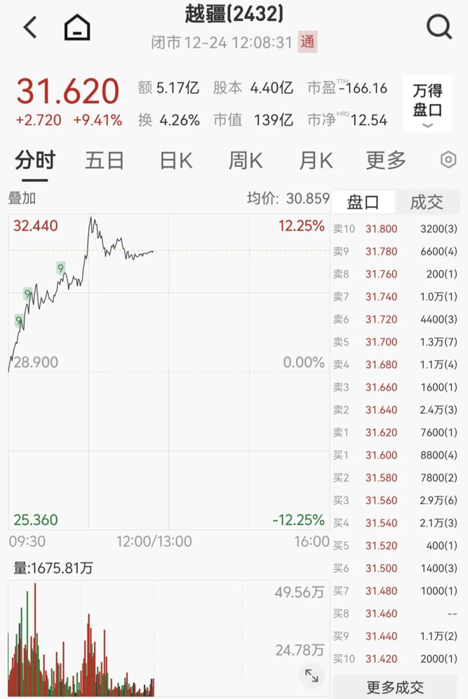 12月24日,越疆股价开盘后直线拉升,最高涨幅达12.25%,随后涨幅收窄,最终收于31.62港元,涨9.41%。