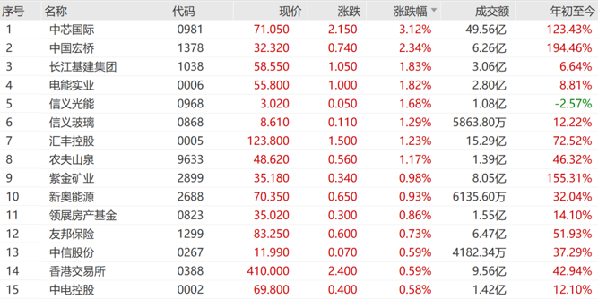 中芯国际涨3.21%,中国宏桥涨2.34%,长江基建集团涨1.83%,领涨蓝筹。
