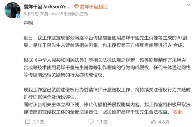 声明指出,根据《中华人民共和国民法典》等相关法律法规规定,该等剧集制作方采用AI合成等技术使用易烊千玺肖像等制作剧集的行为构成侵权,任何主体通过网络等传播前述相关剧集的行为亦构成侵权。