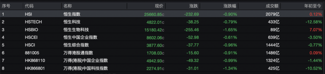 4月13日,港股三大指数震荡走弱,市场在外围扰动下承压。截至收盘,恒生指数收跌0.90%,报25660.85点;恒生科技指数跌0.79%,报4822.01点;恒生中国企业指数下跌0.61%,报8602.06点。全日大市成交额为2079亿港元,南向资金净买入22.49亿港元。