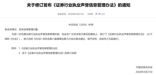 3月27日,中证协发布新版《证券行业执业声誉信息管理办法》(以下简称《办法》),即日起实施。这是该《办法》自2022年启用以来首次进行修订。