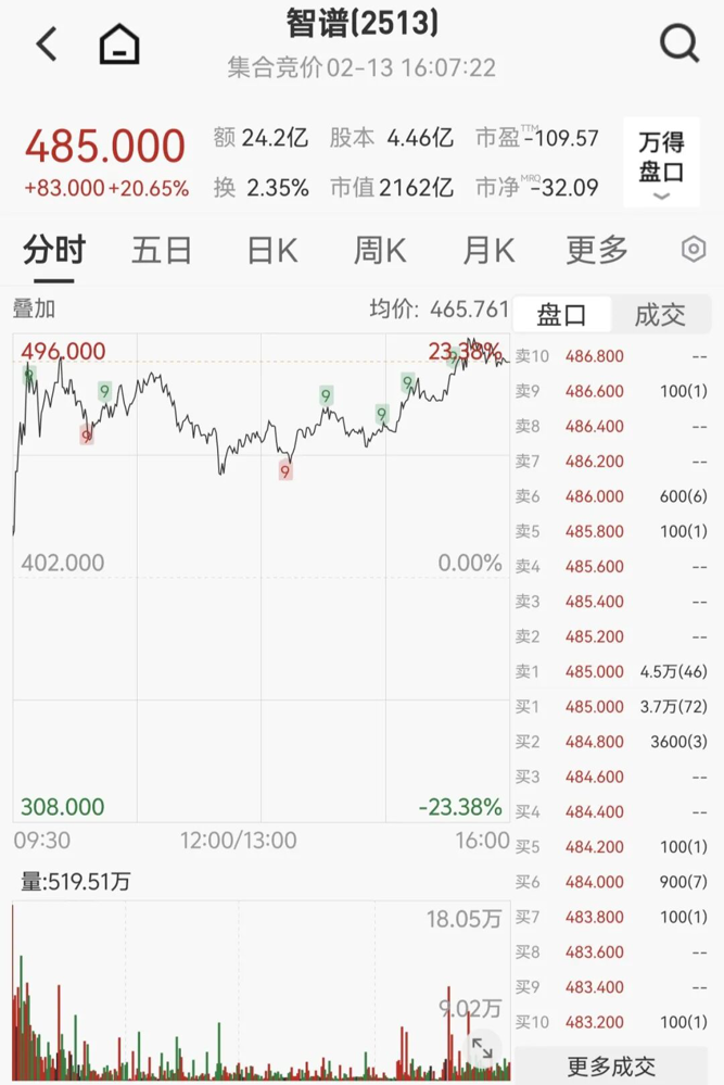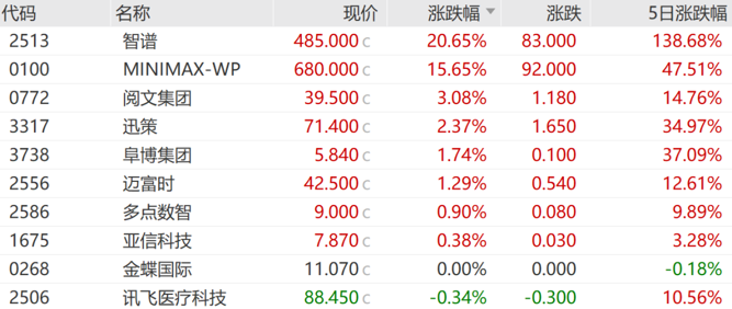 “全球大模型第一股”智谱最高涨幅达23.28%,全天收于485.00港元/股,大涨20.65%。