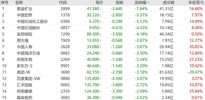 恒生指数成份股中16只上涨,68只下跌,贵金属及石油股领跌:紫金矿业跌7.64%,受金银价下挫影响,黄金概念股集体走低;中国石油化工股份跌5.12%,中国石油股份跌4.33%,特朗普称美国必须与伊朗达成协议,国际油价周四大跌。