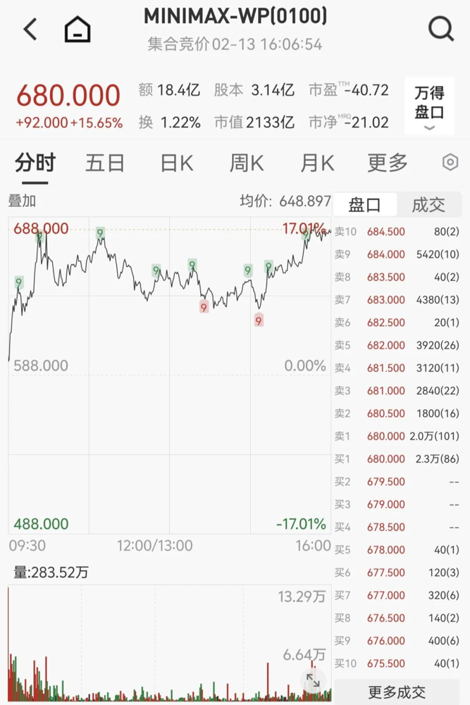 2月13日,港股“AI大模型双星”——智谱、MINIMAX再度大涨,盘中股价再创上市以来新高,最新市值双双突破2100亿港元!