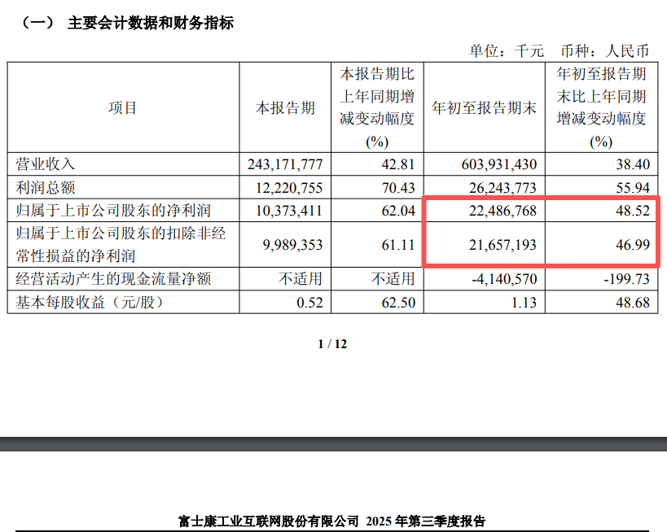 以工业富联为例,其2025年前三季度的归母净利润为224.87亿元,同比增长48.52%;扣非后净利润为216.57亿元,同比增长46.99%。