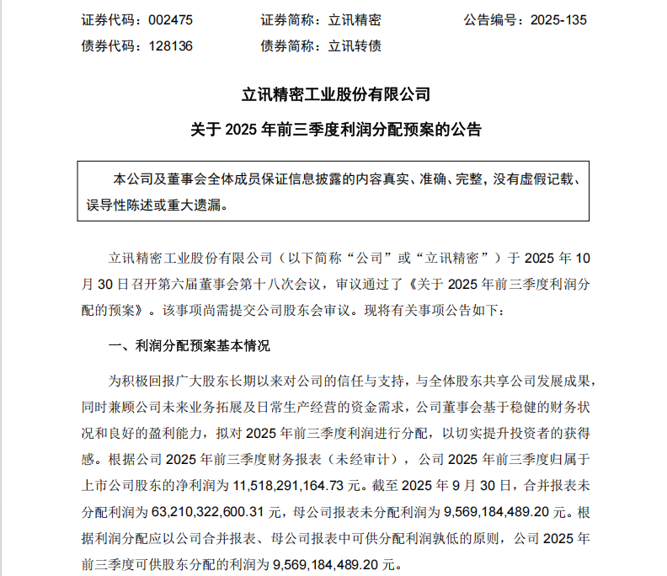 这是立讯精密首次发布前三季度利润分配预案,凸显了A股电子行业头部公司实施多次分红的决心。
