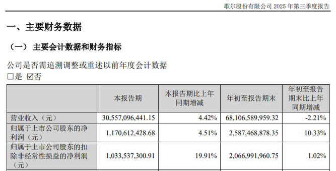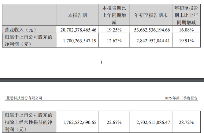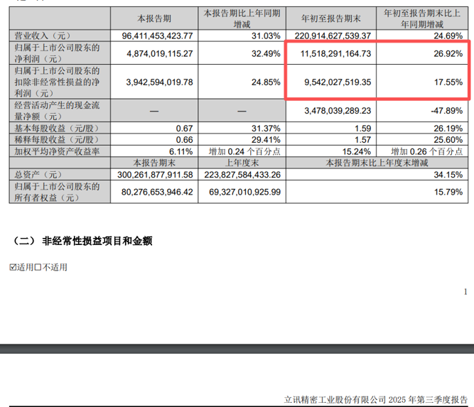 2025年前三季度,立讯精密的归母净利润为115.18亿元,同比增长26.92%;扣非后净利润为95.42亿元,同比增长17.55%。