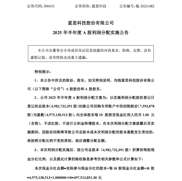 部分A股电子行业头部公司,已经完成2025年中期利润分配方案。以蓝思科技为例,其10月28日向全体股东每10股派发现金红利1元(含税),合计拟派发现金红利4.98亿元(含税)。