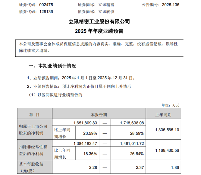 10月30日晚间,立讯精密公告称,预计2025年全年的归母净利润为165.18亿元至171.86亿元,同比增长23.59%至28.59%;扣非后净利润138.42亿元至148.10亿元,同比增长18.36%至26.64%。
