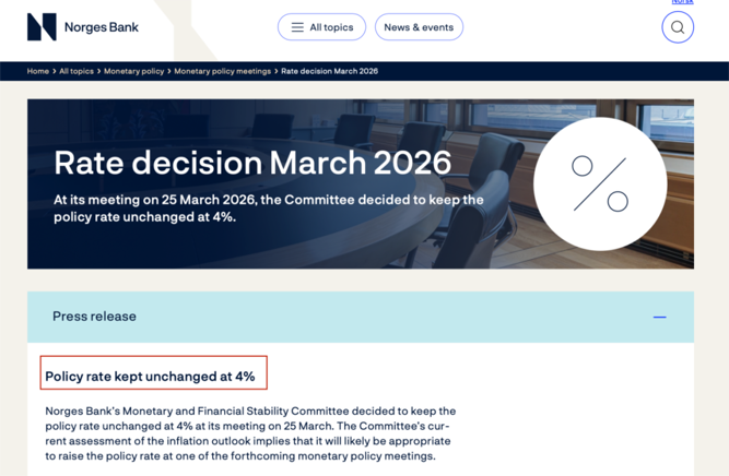 【导读】挪威央行维持基准利率在4%不变