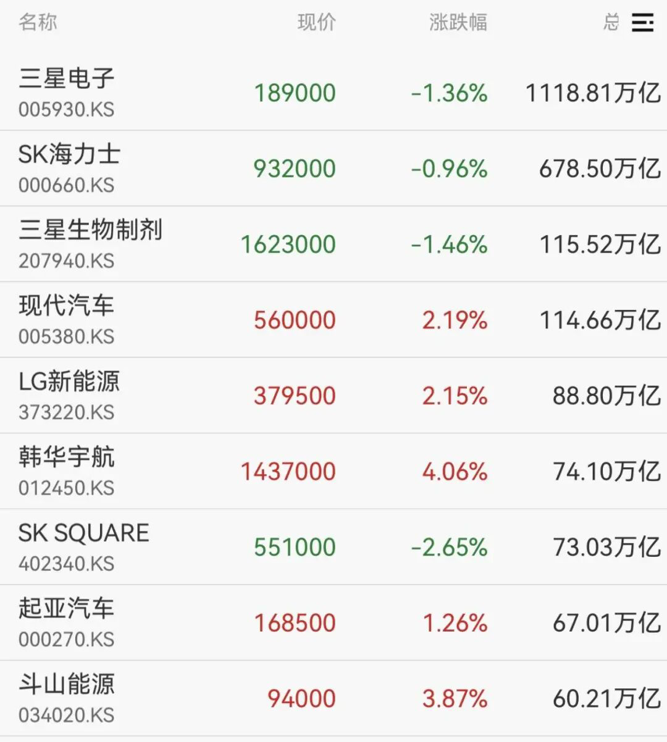 权重股涨跌互现,三星电子、SK海力士、三星生物制剂纷纷走低,现代汽车、LG新能源、韩华宇航均涨超2%。