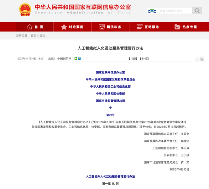 4月10日,国家网信办、国家发展改革委、工业和信息化部、公安部、市场监管总局联合公布《人工智能拟人化互动服务管理暂行办法》(以下简称《办法》),自2026年7月15日起施行。