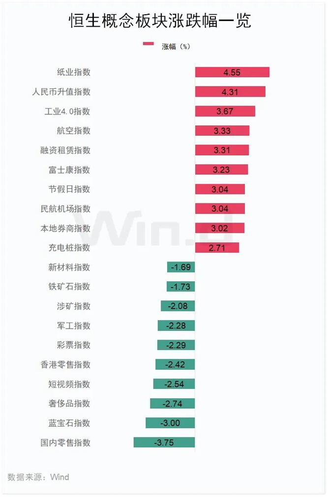 从盘面来看,Wind概念板块涨跌不一,纸业指数涨4.55%,人民币升值指数涨4.31%,工业4.0指数涨3.67%;国内零售指数跌3.75%,蓝宝石指数跌3%,奢侈品指数跌2.74%。