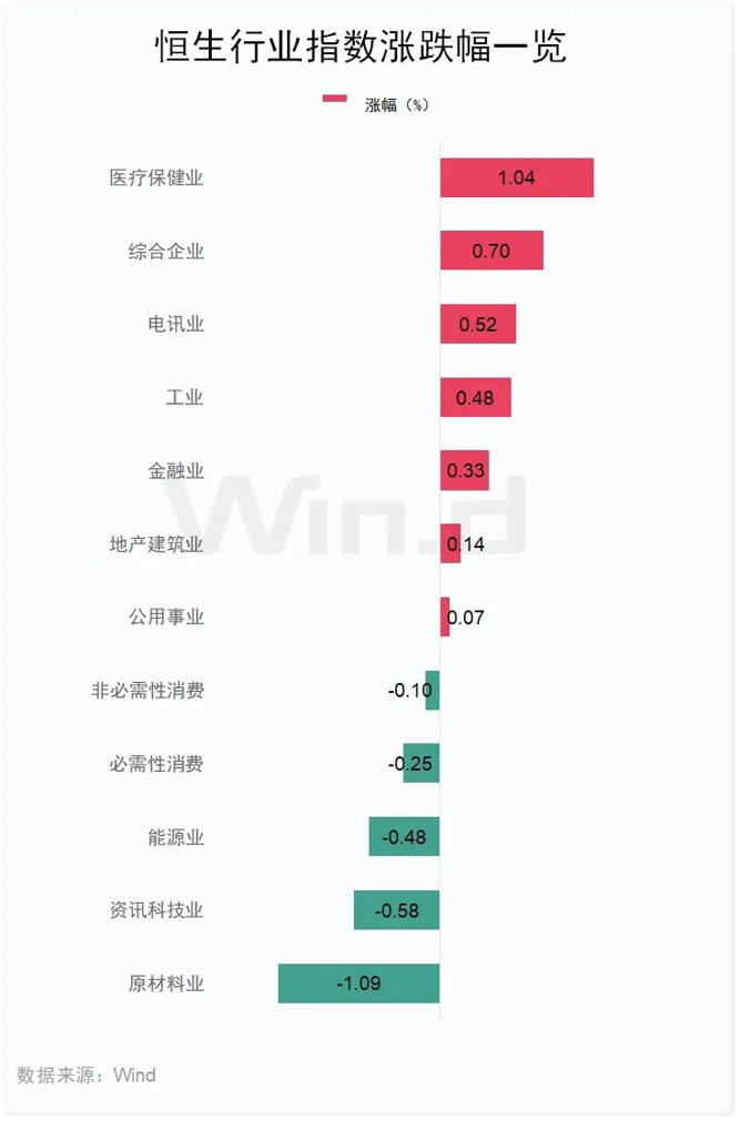 恒生行业指数方面,医疗保健业指数上涨1.04%,综合企业指数上涨0.70%,电讯业指数上涨0.52%。跌幅方面,原材料业指数下跌1.09%,资讯科技业指数下跌0.58%。