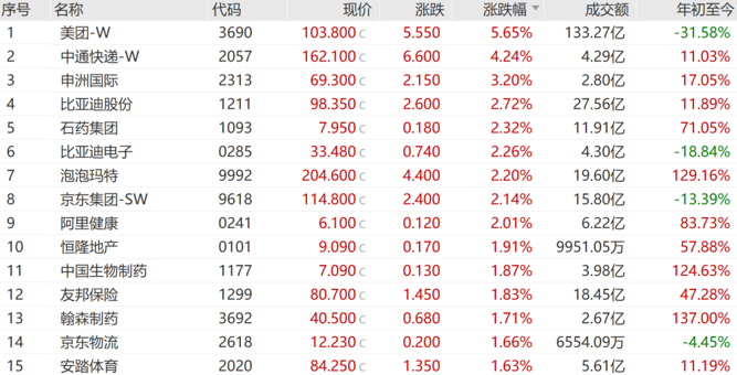 恒生指数成份股中51只上涨,32只下跌。美团上涨5.65%,中通快递涨4.24%,申洲国际涨3.20%,领涨蓝筹股。