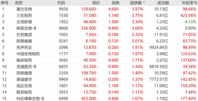 康方生物涨3.97%,三生制药涨3.75%,云顶新耀涨3.34%,领涨恒生生物科技指数成份股。