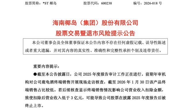 另外,存在年审机构对*ST椰岛2025年度财务报表或内部控制出具非无保留意见的可能,也可能导致该公司被终止上市。