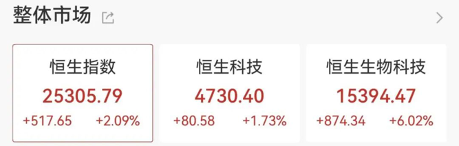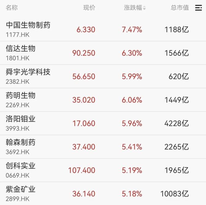 港股市场同样走高,恒生指数涨超2%,中国生物制药、信达生物、药明生物均涨超6%。
