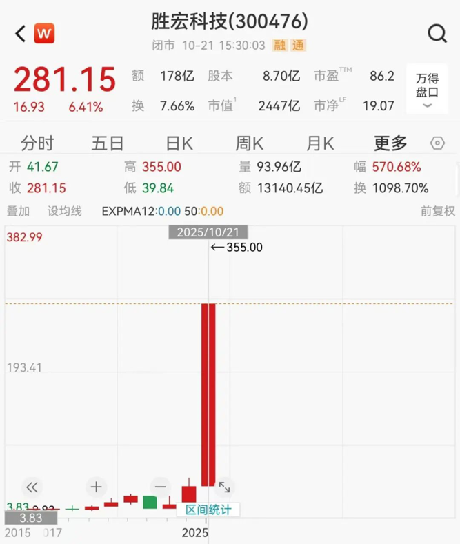 从市场表现看,截至10月21日收盘,胜宏科技股价报281.15元/股,今年以来累计涨幅超570%,较248.02元/股定增价,已有不小的涨幅,最新市值为2447亿元。