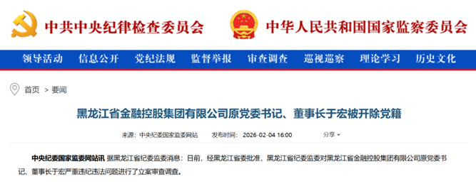 2月4日,中央纪委国家监委官网通报:黑龙江省金融控股集团有限公司原党委书记、董事长于宏被开除党籍。
