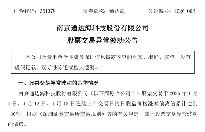公告显示,1月9日、1月12日、1月13日,通达海连续三个交易日的收盘价涨幅偏离值累计超30%。根据《深圳证券交易所交易规则》等有关规定,通达海的上述情况,属于股票交易异常波动的情形。