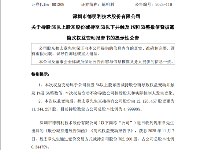 11月8日,德明利公告称,魏宏章11月7日通过集中竞价交易方式减持公司股份78.22万股,占公司总股本的0.34475%。魏宏章将继续实施此前披露的减持计划。