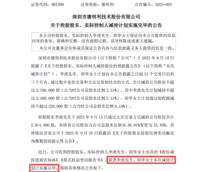 9月23日,德明利公告称,公司近日收到李虎、田华出具的《股份减持进展告知函》《简式权益变动报告书》,获悉李虎、田华的减持计划已实施完毕。