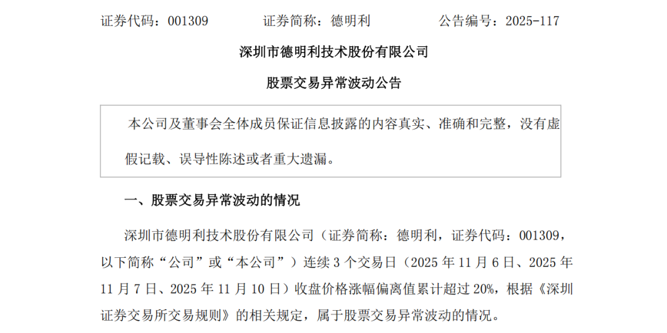 10月23日、10月24日、10月27日,德明利连续3个交易日的收盘价涨幅偏离值累计超过20%,属于《深圳证券交易所交易规则》规定的股票交易异常波动情况。