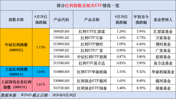4月28日,A股三大指数集体收跌,成长赛道领跌,市场超3600只个股下跌。在此背景下,红利指数凭借高股息、分红稳定等核心属性逆市走强,多只红利类产品收红,成为震荡行情中稀缺的“避风港”。