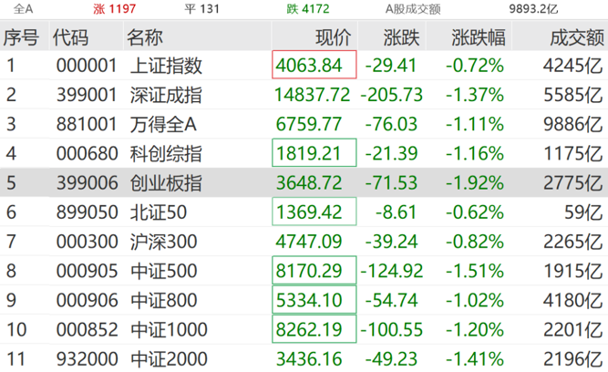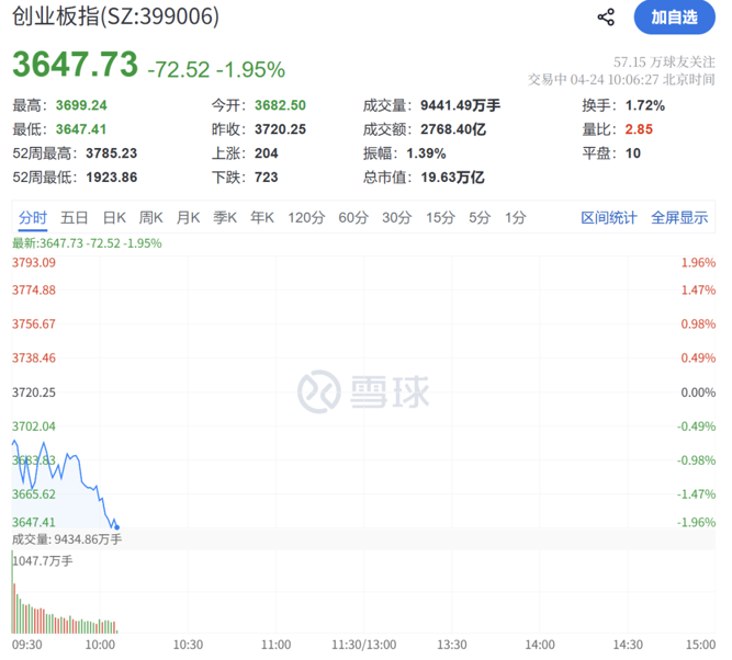 4月24日,A股主要指数开盘绿多红少,创业板指跌超1%。随后市场持续震荡,截至发稿,创业板指跌近2%,深证成指跌超1%,全市场超4100只个股下跌。