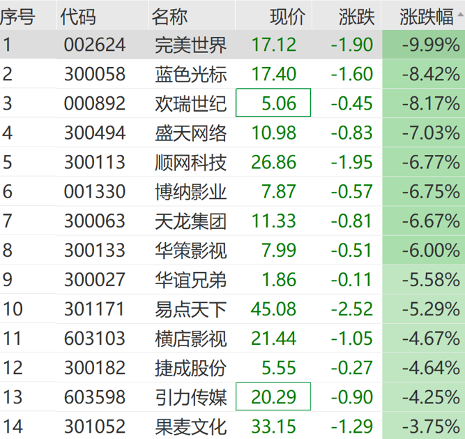 个股方面,完美世界跌停,欢瑞世纪、蓝色光标跌超8%,盛天网络、顺网科技等跟跌。