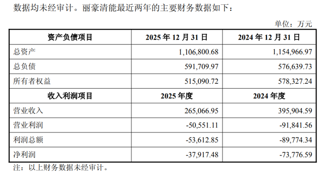 不过从业绩情况来看,丽豪清能过去两年均处于亏损状态。2025年丽豪清能实现营业收入26.51亿元,净利润亏损3.79亿元;2024年丽豪清能实现营业收入39.59亿元,净利润亏损7.38亿元。