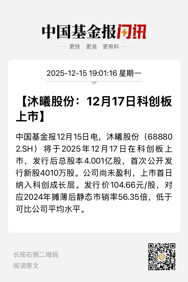 12月15日晚间,沐曦股份公告称,公司股票将于2025年12月17日在上海证券交易所科创板上市,由于公司尚未盈利,自上市之日起将纳入科创成长层。