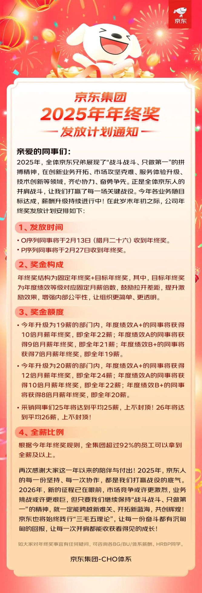 【导读】京东集团公布2025年终奖发放计划,总投入同比增长超70%