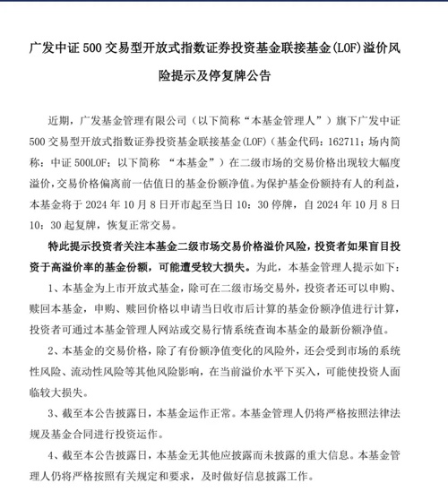 包括创科技ETF、创业板LOF基金、金选300A类LOF、国企改革LOF、并购重组LOF、中概互联ETF、广发中证500ETF联接(LOF)、汇添富中证500指数(LOF)A、易方达并购重组LOF等在内的多只基金发布公告,均表示基金二级市场交易价格明显高于基金份额净值,出现较大幅度溢价,为了保护投资者的利益,将于10月8日上午停牌1小时。与此同时,还有多只场内基金提示溢价风险,但尚未宣布停牌,包括创业板2年定开、双创龙头ETF等。有公募人士告诉记者,由于LOF和ETF既可以在交易所内买卖,也可以申购和赎回,因此容易出现二级市场交易价格溢价比较高的情况。“当投资者对某只LOF或ETF的需求增加时,尤其是在市场对某些资产追捧时,可能会导致二级市场的交易价格高于基金的净值,从而产生溢价,今年以来原油类、黄金类基金均出现过这种现象。”他说。节前A股市场指数和个股呈现疯牛迹象。节前的5个交易日(9月24日至9月30日),A股三大指数中,创业板指暴涨42.12%,表现尤其突出,受到市场追捧,因此相关场内基金溢价较多。而在国庆长假A股休市期间,港股中概股表现抢眼,部分QDII基金也出现溢价,因此也有基金公司提示旗下QDII类场内基金的溢价风险。