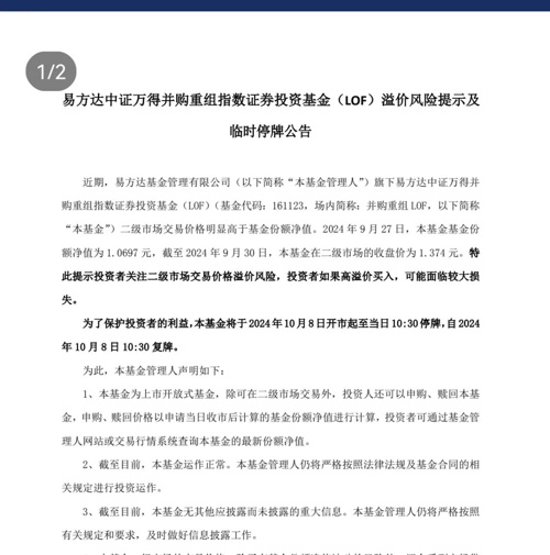 市场大涨点燃了投资者的热情,基金市场热度陡增。为了保护投资者的利益,基金公司开始采取措施。前海开源基金宣布今日起对其旗下74只基金同时实施低至1000元的限购,而易方达基金、广发基金、汇添富基金等多家基金则宣布旗下存在溢价的LOF基金停牌1小时。10月8日,国庆节后第一个交易日,前海开源基金发布《关于旗下部分基金限制大额申购、转换转入业务的公告》。公告显示,前海开源基金决定即日起对旗下74只基金采取限购,单日每个基金账户累计申购(含转换转入)公告内所涉单只基金的最高金额调整为1000元(含)。据了解,本次限购所涉及的基金主要为前海开源基金旗下持有A股股票及可转债的基金。同时对旗下基金实施如此大规模的限购政策,并且统一将限额降至1000元,在公募行业内实属罕见。对此,前海开源基金对记者表示,国庆长假期间,部分中概股的股价在海外市场的上涨程度远超其在A股市场的单日涨幅限制。鉴于此,为防止潜在的大规模申购导致大幅摊薄现有基金份额持有人的利益,前海开源基金基于专业、勤勉、尽责的原则和义务,保护现有基金份额持有人的合法权益,根据相关基金合同和招募说明书的有关规定,决定对公司旗下持有A股股票及可转债的共计74只基金采取本次限购措施。前海开源基金同时表示,公司将持续关注市场动态,及时调整相关限额情况。除基金公司“紧急”公告限购外,在A股节后开盘第一天,多只场内基金宣布临时“停牌”。10月7日晚间,国泰创业板LOF、中银证券BOCI创业板ETF、鹏华创业板LOF基金、国联安创科技ETF等4只创业板相关场内基金发布溢价风险提示和停牌公告,宣布将在10月8日早上停牌一小时。至于停牌的原因,以国泰基金为例,其在公告中指出,旗下国泰创业板LOFA类基金份额近期二级市场交易价格大幅波动,且场内交易价格较基金份额净值的溢价幅度较高。特此提示投资者关注二级市场交易价格溢价风险,投资者如果高溢价买入,可能面临较大损失。为了保护投资者的利益,该基金将于10月8日开市起至当日10:30停牌,自2024年10月8日10:30复牌。
