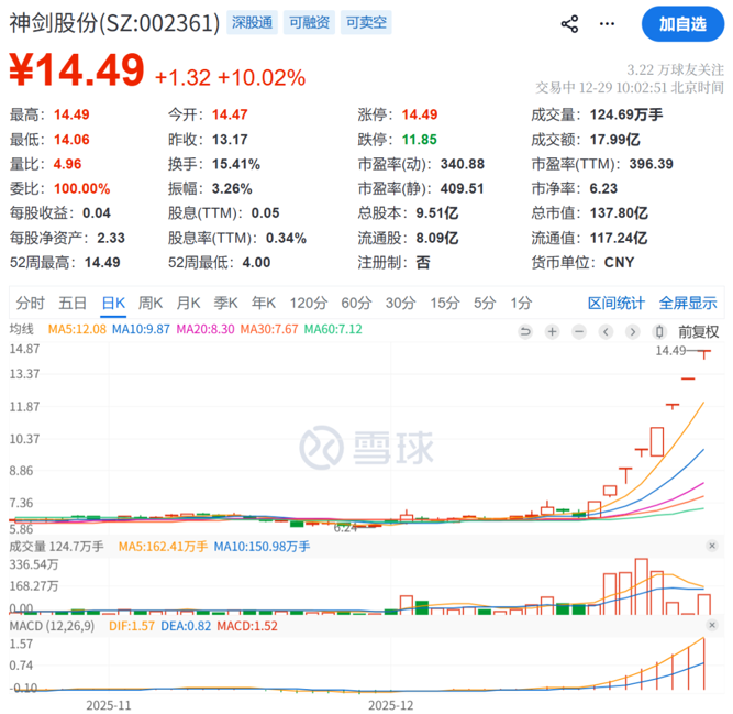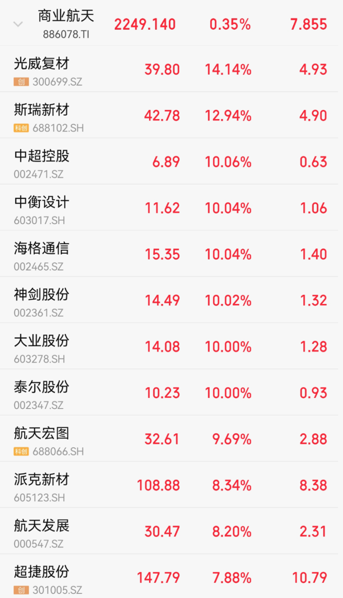 12月29日上午,商业航天板块再度活跃,斯瑞新材、通宇通讯等盘中创新高,神剑股份8连板,大业股份4连板,泰尔股份3连板,中超控股2连板,中衡设计涨停,光威复材涨超14%。