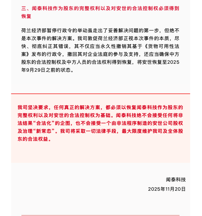 闻泰科技认为,荷兰经济部暂停行政令的举动虽走出了妥善解决问题的第一步,但绝不是本次事件的解决方案。公司敦促荷兰经济部正视本次事件的本质,尽快、彻底纠正其错误,其不仅应当永久性撤销其基于《货物可用性法案》发布的行政令,撤回其对企业法庭的参与及支持,还应当确保中方股东的合法控制权及中方人员的合法权利得到恢复,将安世恢复至2025年9月29日之前的状态。