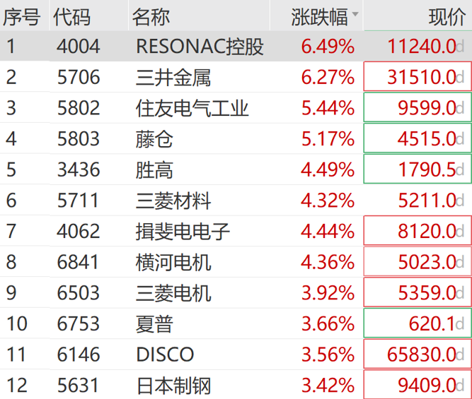 4月3日上午,日股电子、半导体、金属等板块大涨。半导体材料巨头Resonac盘初暴涨超6%,三井金属、住友电气工业、胜高、三菱电机等纷纷大涨。