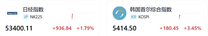 4月3日,日韩股市早间双双高开:日经225指数涨1.17%,韩国KOSPI指数大涨2.77%。随后,市场集体上行,日经225指数一度涨至53400点,涨超900点;韩国KOSPI指数涨幅超3%。