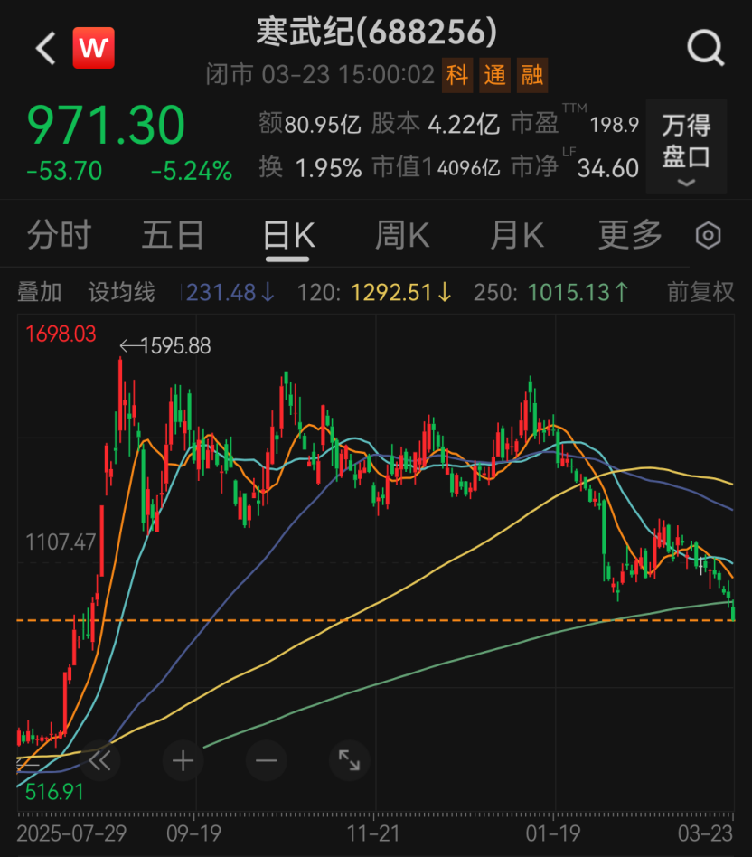 3月23日,A股AI芯片“榜一大哥”寒武纪股价大跌,且跌破了颇具象征意义的年线和千元大关,以971.3元/股报收。相对于2025年8月28日的历史最高点,寒武纪近7个月股价跌幅达39.14%。