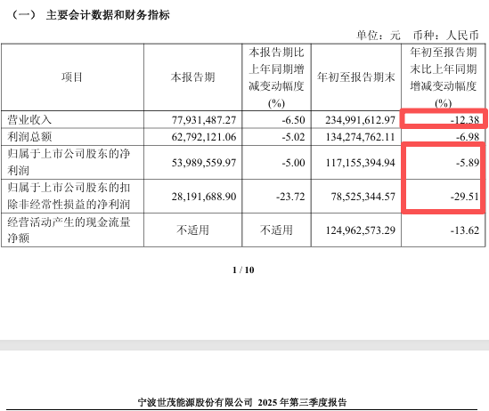 2025年前三季度,世茂能源的营业收入、归母净利润、扣非后净利润,同比分别下降12.38%、5.89%、29.51%。