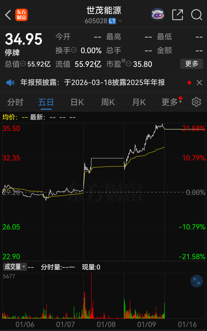 世茂能源在停牌前股价连番大涨,1月8日以涨停收盘,1月9日收盘涨幅超8%。1月9日收盘,世茂能源股价报34.95元/股,总市值为55.92亿元。