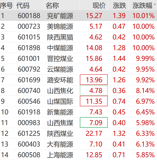 2月4日上午,煤炭板块盘中直线拉升,成份股全部飘红;兖矿能源、陕西黑猫、云煤能源、中煤能源、美锦能源等纷纷涨停,山煤国际、陕西煤业等跟涨。