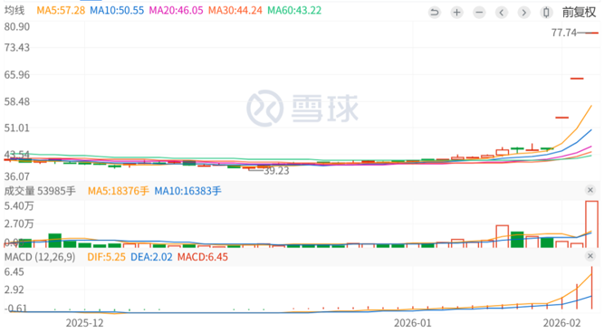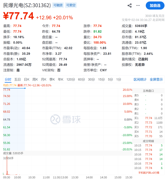 2月4日,民爆光电在竞价阶段即走出20cm涨停,报77.74元/股,实现3连板。截至发稿,民爆光电仍保持涨停状态。