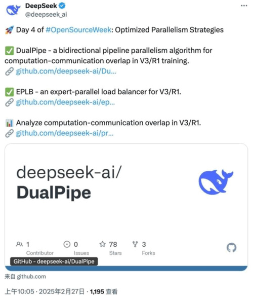 2月27日,在“开源周”第四日,DeepSeek宣布开源Optimized Parallelism Strategies。