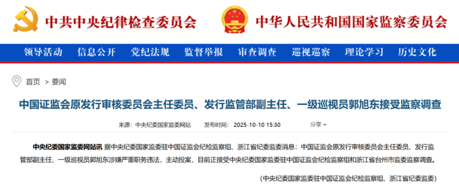 10月10日,中央纪委国家监委官网通报:中国证监会原发行审核委员会主任委员、发行监管部副主任、一级巡视员郭旭东涉嫌严重职务违法,主动投案,目前正接受中央纪委国家监委驻中国证监会纪检监察组和浙江省台州市监委监察调查。