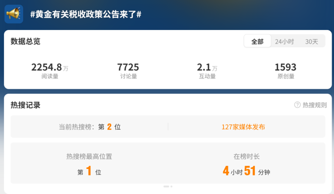 “黄金有关税收政策公告来了”的词条也登上微博热搜榜首位,引发大量投资者关注。
